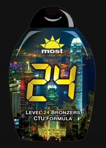 2008 Most 24 Level 24 Bronzers CTU Formula 13.5 oz Use every second of your tanning time wisely. 24 is an ultra-bronzing formula with Level 24 Bronzers for maximum results in every tanning session. The CTU (Continuous Tanning Utopia) Formula is supported by Biotanning Complex for an intense , lasting tan. A skin-firming complex tightens and tones while an energy boost of caffine, taurine, and pomegranate extract provide ptent antioxidants for a fresh, radiant tan. MORE ITEMS